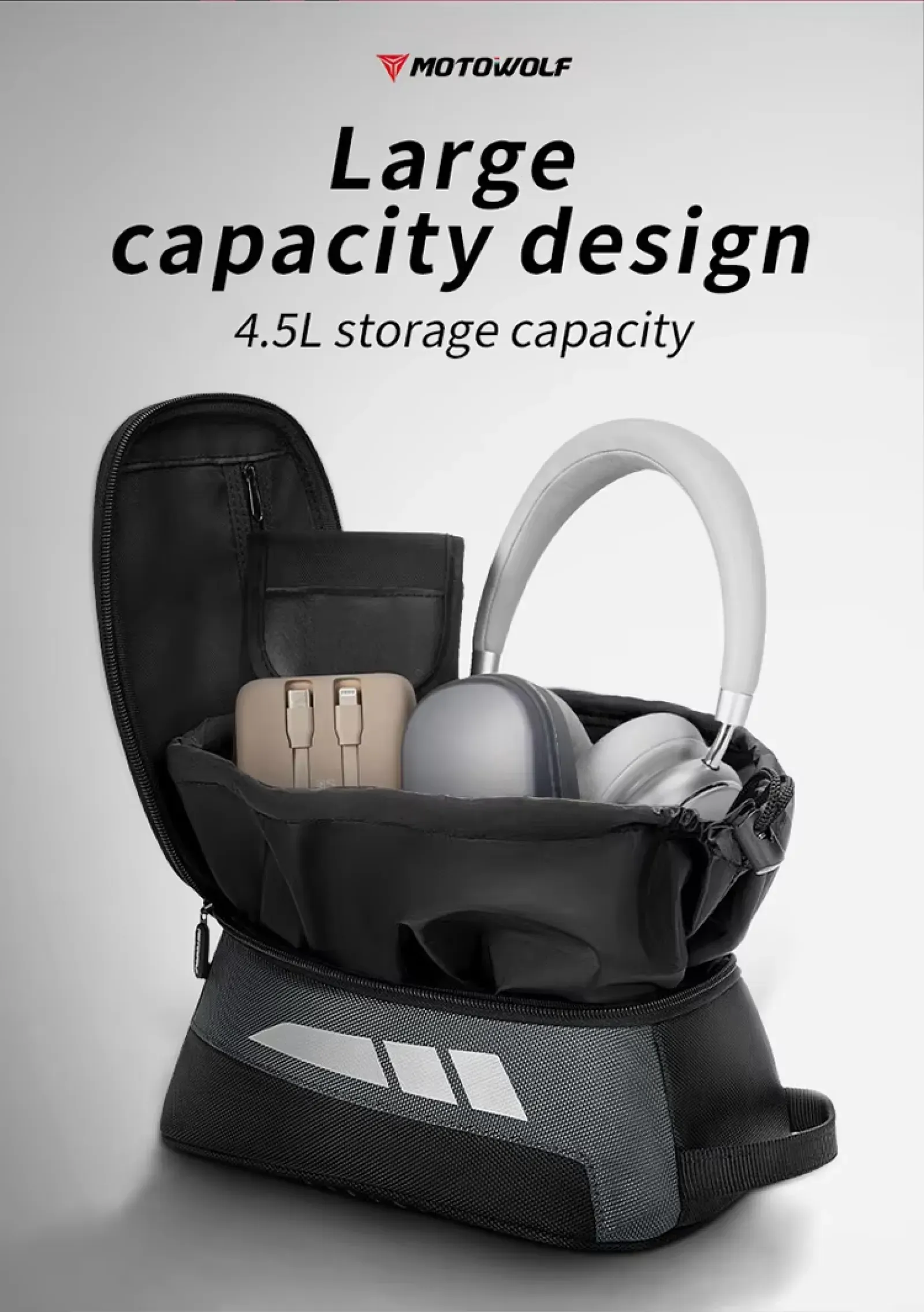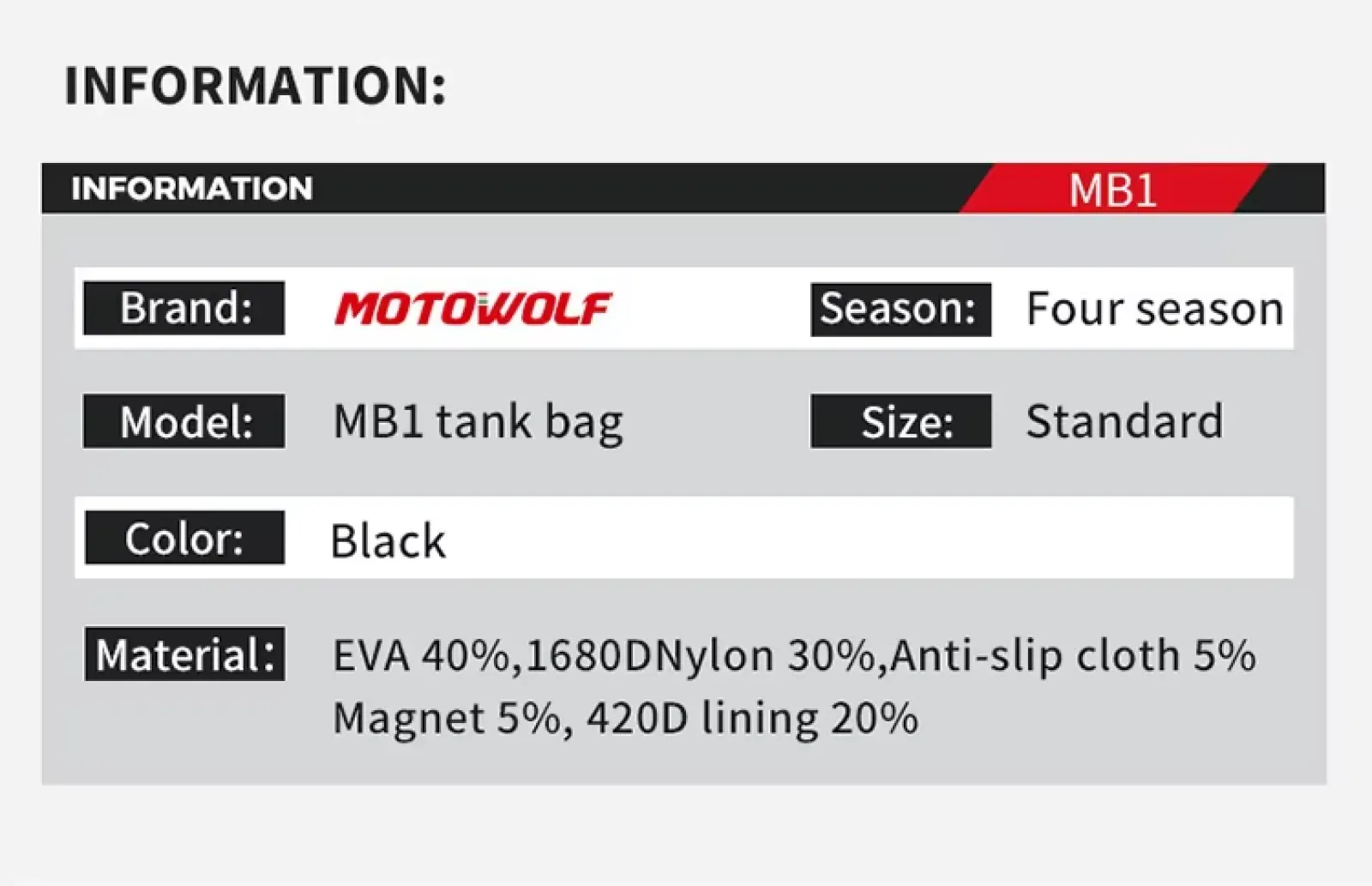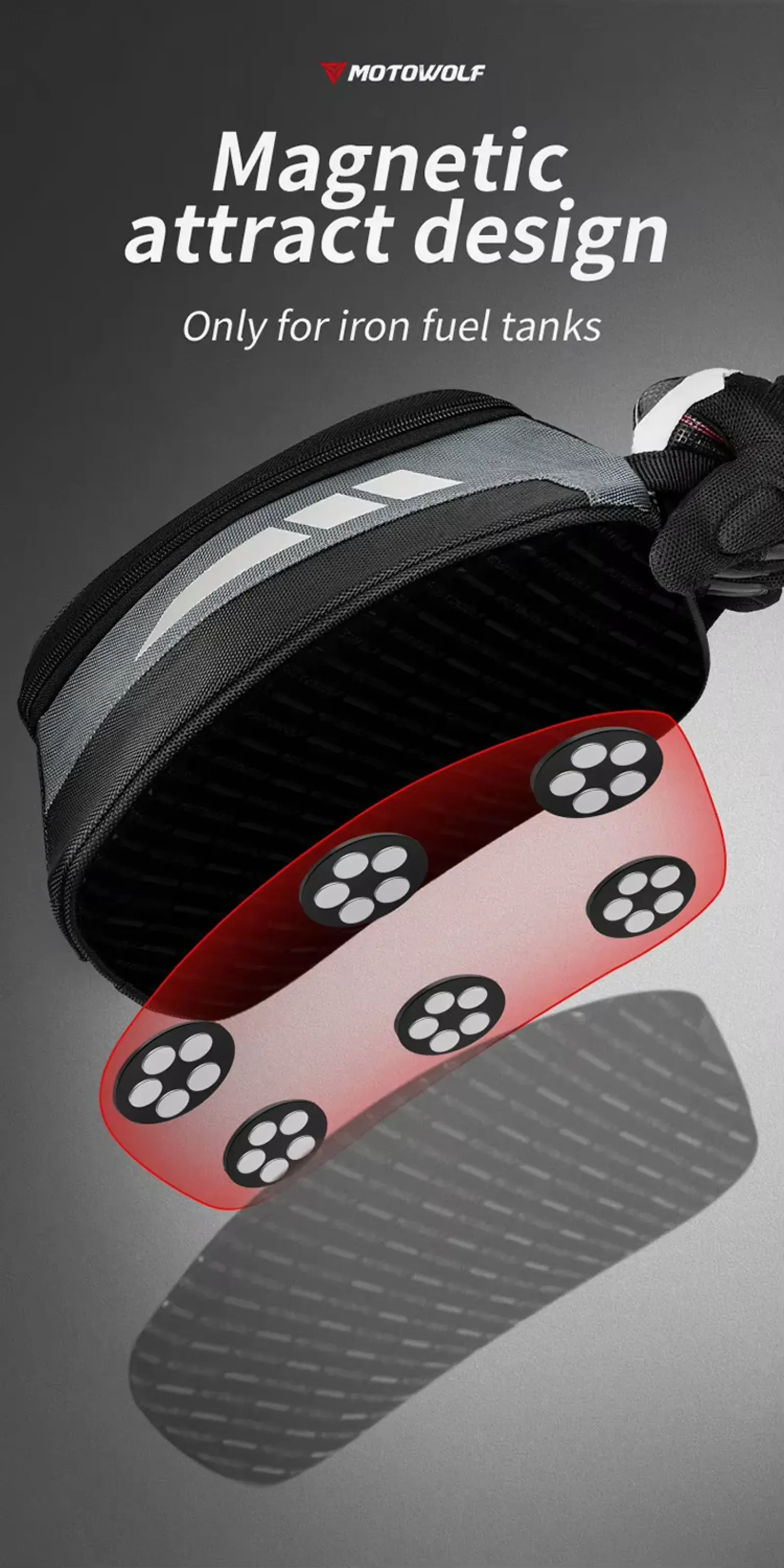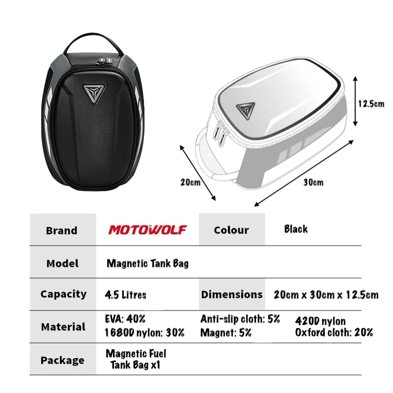 The Motowolf MB1 is a compact, magnetic 4.5-liter motorcycle tank bag designed for daily commuting and short tours. It features a rigid construction, strong magnetic attachment, and includes a waterproof rain cover.